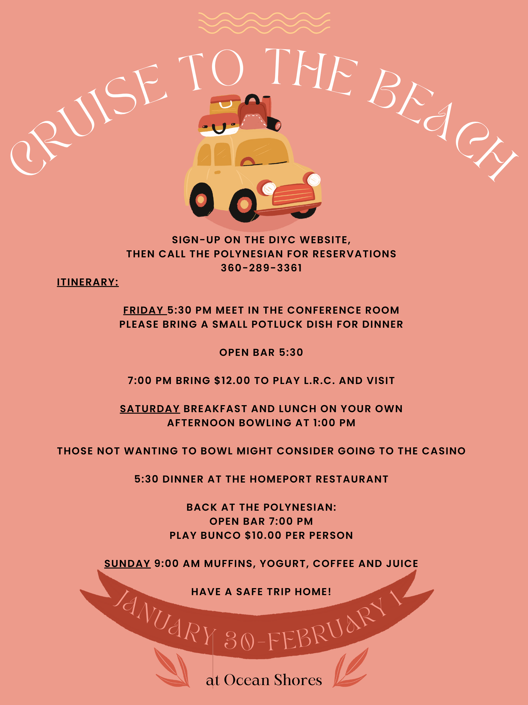 We will be staying at the Polynesian Resort for the weekend. It is an event filled with the beach, games, and food! Sign up here first, then call Polynesian directly to book a room (360)289-3361 or reserve online. Let them know that you are with the Day Island Yacht Club group. Check the Captain’s Log for updates about when to call the Polynesian and for an itinerary from the cruise captain. If you have questions, please contact Karen Vaver 253-732-5768 in the evenings or weekends.